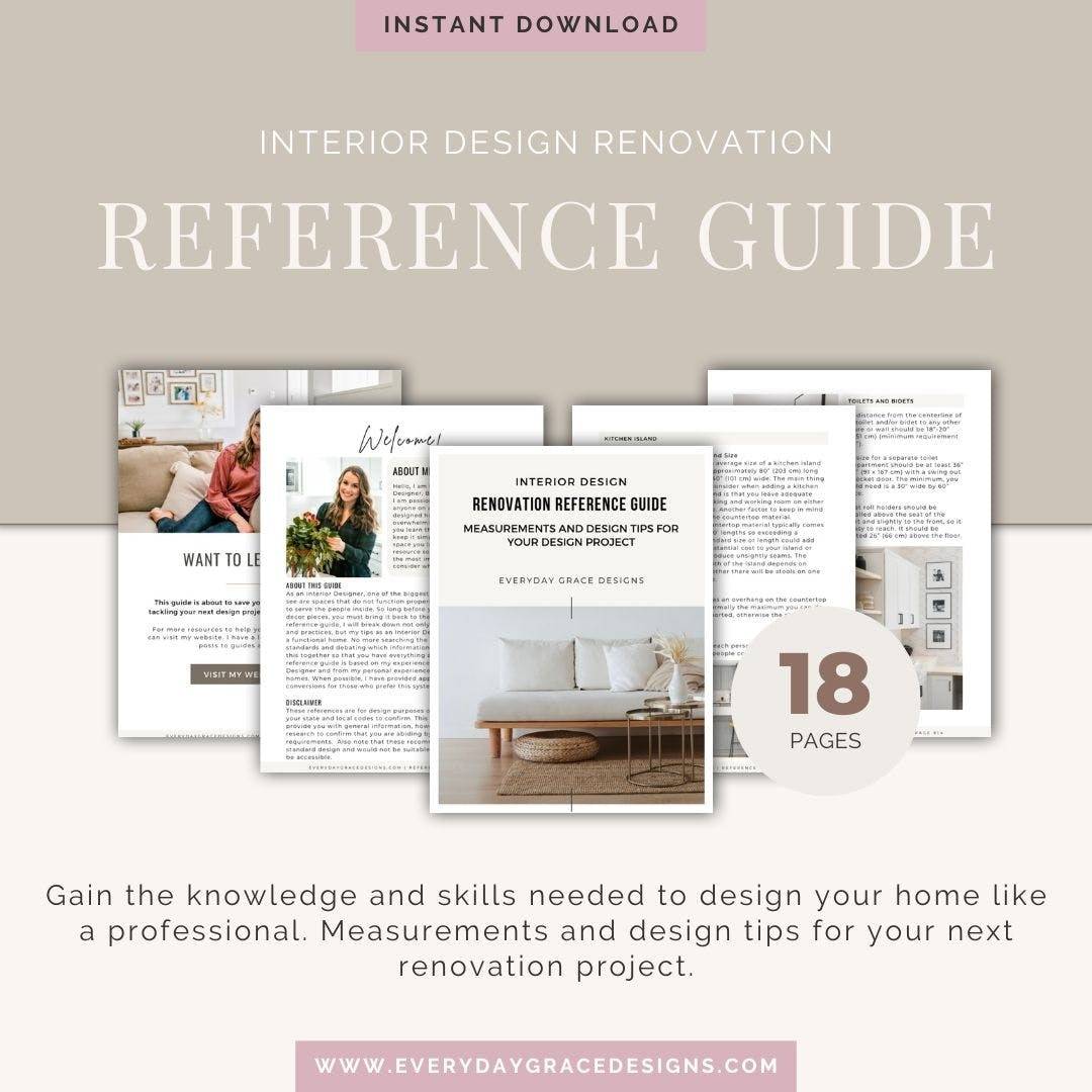 This 18-page comprehensive space planning guide includes all the measurements and tips you need for your next design project. This is the handbook you need to take all the guess work out of your home renovation projects allowing you to make decisions with confidence.